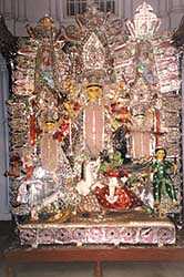 face of a horse.The frame work of the idol is worshipped during 'Rath'.The dhakis and artists are from families with the same lineage. Sacrifice of goats was an important feature of the family. But about 70-80 years ago a member of the family fell ill and miraculously survived. Since then the ritual of sacrifice was stopped. Kumari Puja is performed on both Sashti and Nabami. Sadobha Puja is held too. Immersion, years ago was done on two boats. Immersion is done by carrying the idol on the shoulders. 'Nilkontho' birds are set free. |